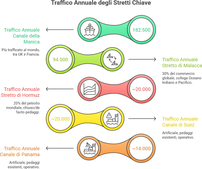 I pedaggi esistono già per Suez e Panama, ma questi sono canali artificiali che richiedono manutenzione costante. Gli altri stretti sono formazioni geografiche naturali, e la loro gratuità è un pilastro del commercio internazionale.
